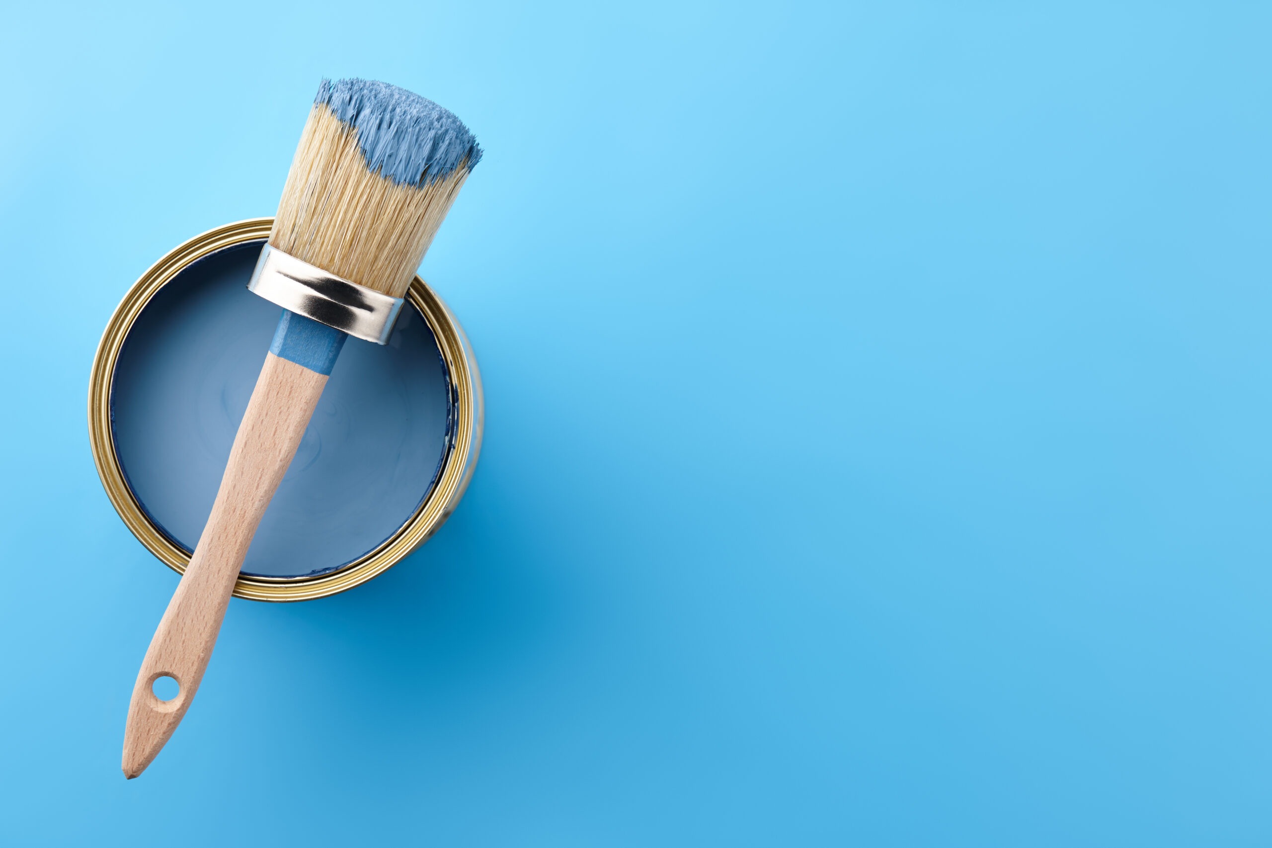 Brush and can of blue paint on blue background